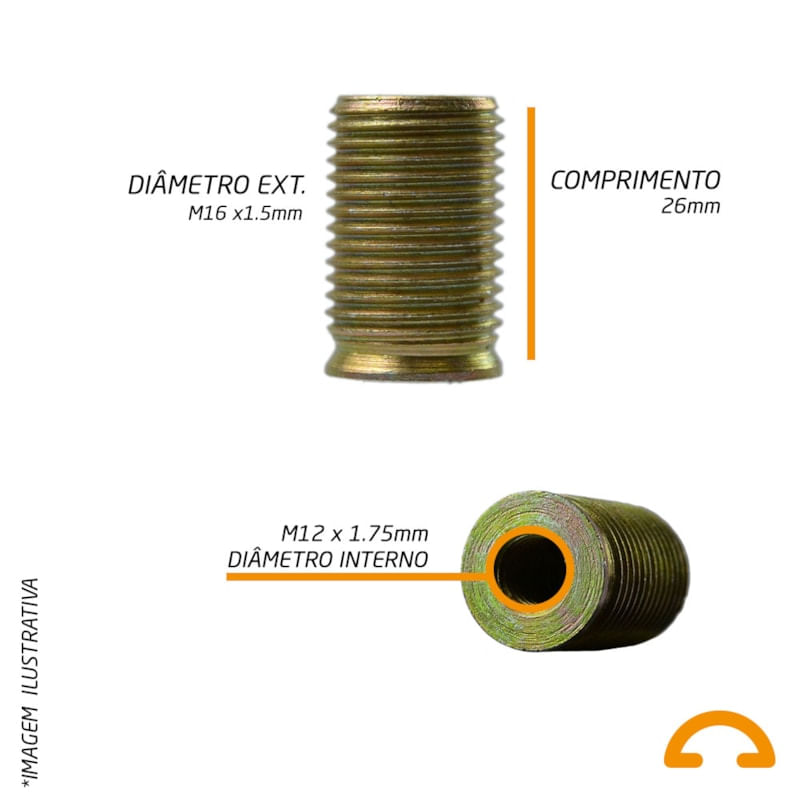 Bucha Carcaça Interno M12 x1,75 Externo M16 x 1,5 Altura 26mm - 10 Unidades